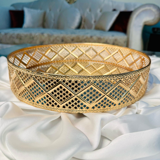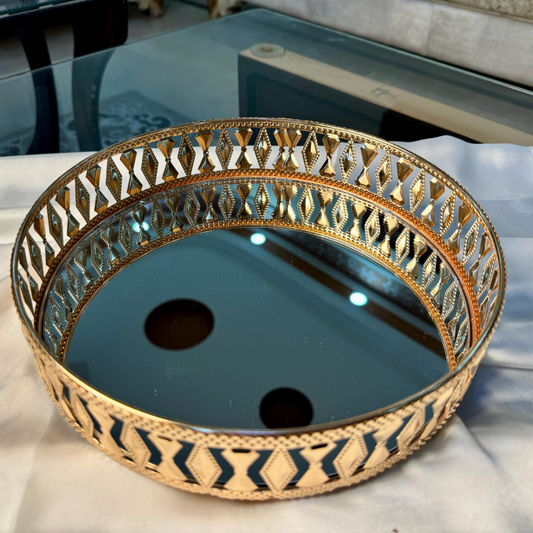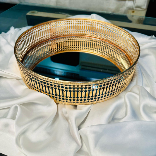Our GOLD FLORAL MIRROR TRAY and LUXURY GOLDEN MIRROR TRAY are standout pieces, combining a rich golden finish with a mirrored base that adds luxury and elegance to your setup.