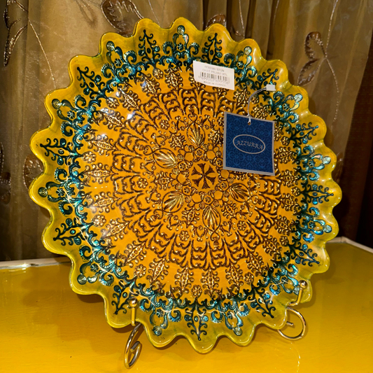 This luxurious serving platter features a stunning golden-green finish, perfect for elegant dining experiences.