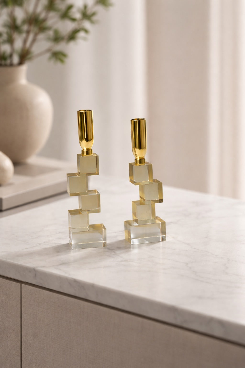 Elevate your home décor with this stunning Geometric Crystal Candle Holder, a perfect fusion of modern architecture and classic luxury. This eye-catching piece features a unique, tiered base made of stacked, high-clarity crystal-style cubes that create a sophisticated "floating" effect.
